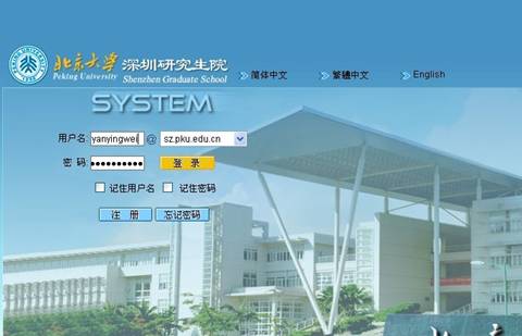 2、输入用户名和密码即可登录,注意:@后面应选择sz.pku.edu.cn ,用户名为学生学号,原始密码为身份证号码后六位,首次登录后需要改密码。
